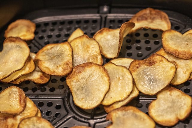 Lightly coat air fryer basket with canola oil cooking spray. Place half of the potato slices in the basket and cook in two batches at 375 degrees until cooked through and crispy, about 25 to 30 minutes.