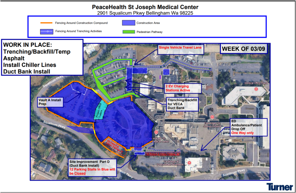 - The entire looping drive lane in front of the ED entrance has reopened, which means motorists dropping off or picking up patients curbside at the ED door are once again able to enter through the west ED driveway off Squalicum Parkway, drive up the hill and around the building to exit the way they came in.